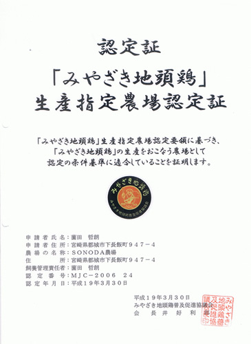 みやざき地頭鶏直販の商品にて「みやざき地頭鶏」シールのある商品は「みやざき地頭鶏普及促進協議会」の認定を受けた農場にて生産された本物のみやざき地頭鶏(じどっこ)です。